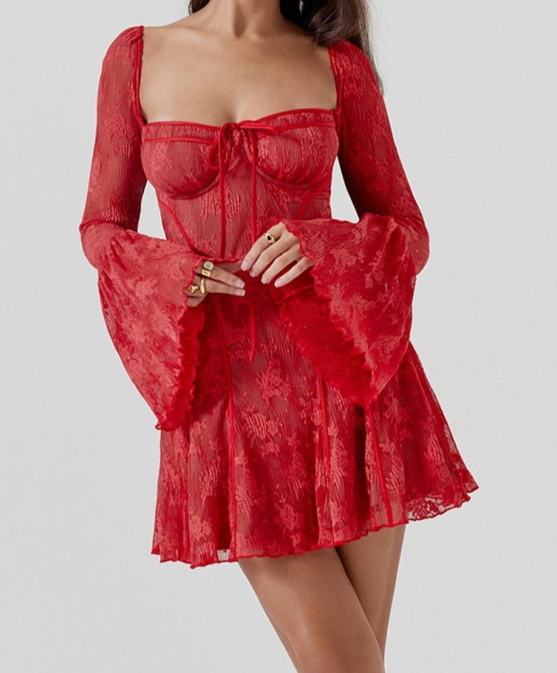 Sublimez votre silhouette avec la robe "Élégance Romantique", un chef-d'œuvre de féminité et de délicatesse. Conçue en dentelle légère et transparente, cette robe à manches longues évasées incarne l'élégance intemporelle. Son corsage ajusté et son encolure carrée flatteuse vous donnent une allure gracieuse et sophistiquée, tandis que la jupe fluide ajoute une touche de légèreté et de mouvement à chaque pas.
