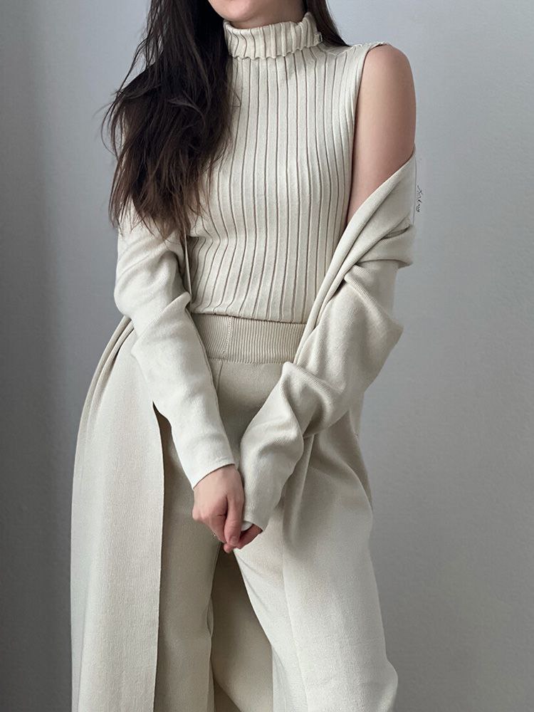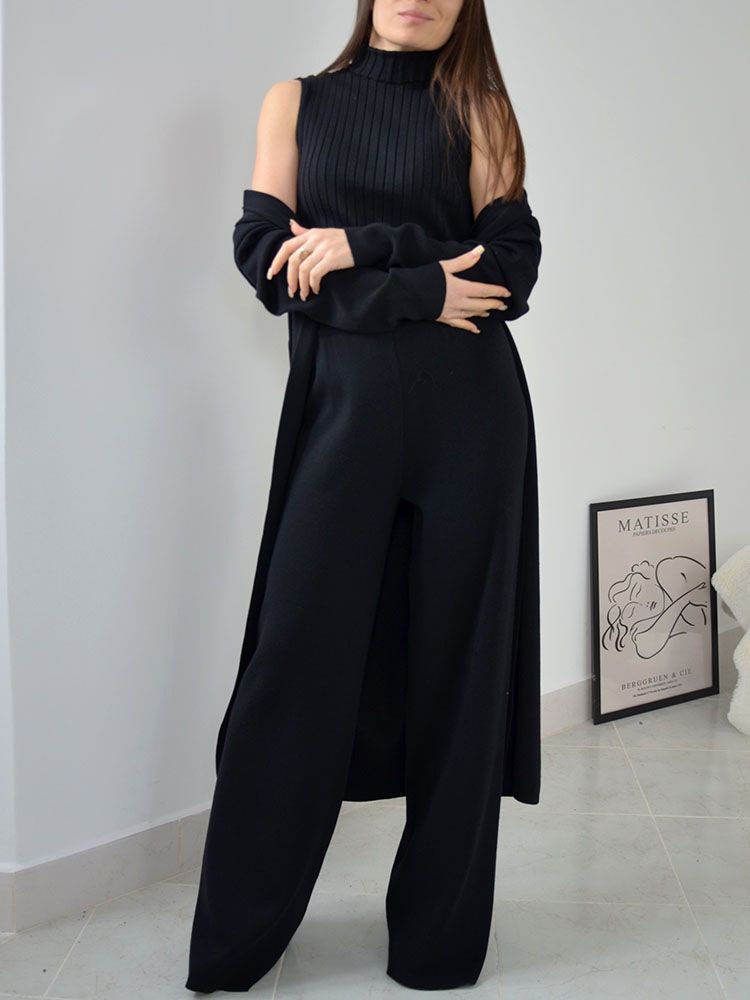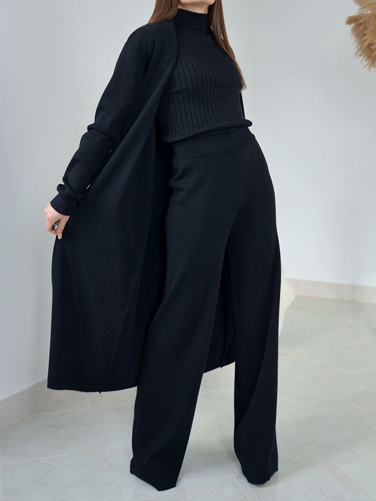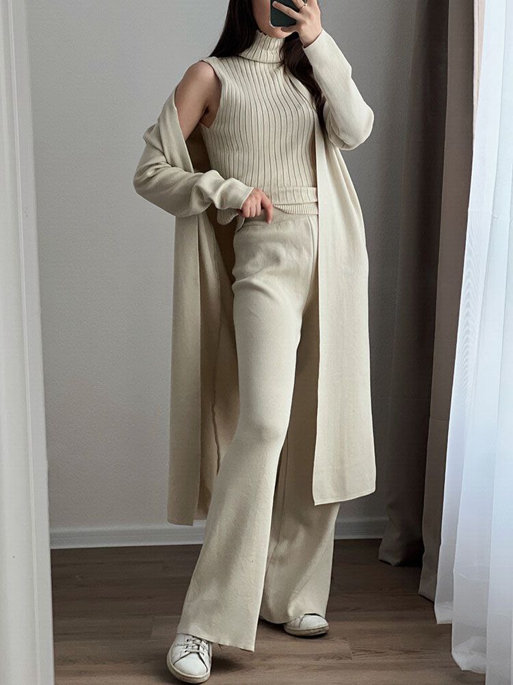 Cette collection inclut un col roulé en maille, un cardigan polyvalent, et un pantalon large élégant. Conçue pour un look soigné et confortable, chaque pièce est faite de matériaux doux et durables, parfaits pour un style polyvalent en toute saison.
